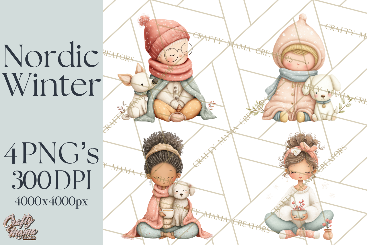 A charming set of 4 high-resolution PNG files embodying the cozy, simple aesthetic of Nordic Winter Hygge. This collection features minimalist figures, elegant deer, rustic wooden elements, and comforting props like lanterns, knitted throws, and simple holiday greenery. Each file is 4000x4000px at 300 DPI, perfect for creating understated holiday greeting cards, cozy home decor prints, and unique sublimation designs.