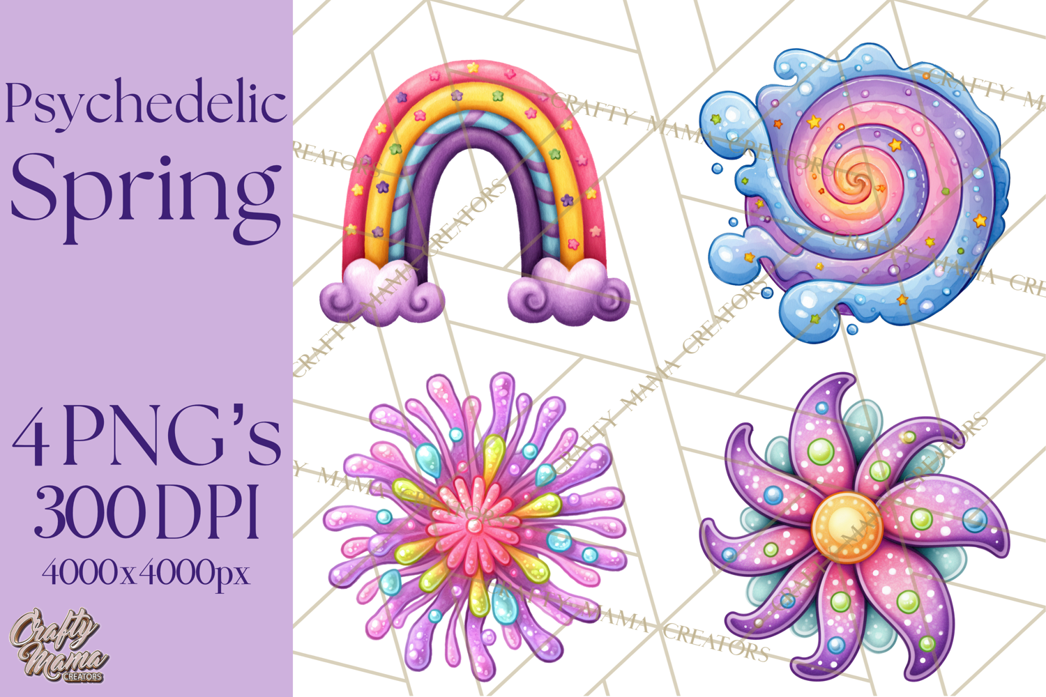 This high-quality graphics collection features 4 unique, vibrant "Groovy Spring" abstract elements in a palette of pinks, purples, and teals. Perfect for adding a cheerful, psychedelic aesthetic to your design projects, posters, invitations, and digital creations.