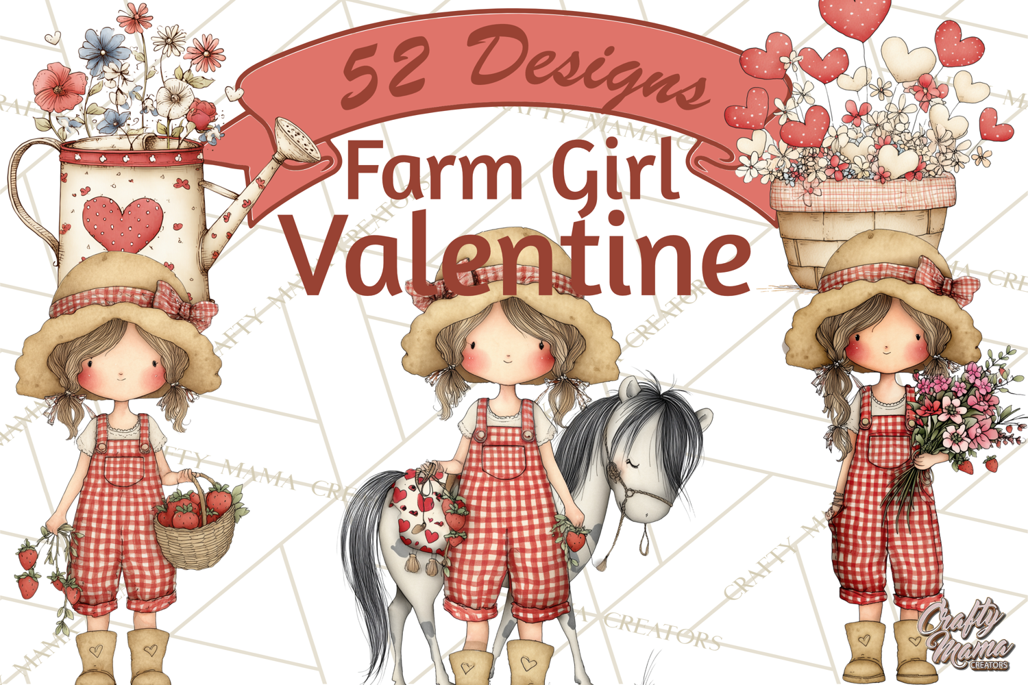 Bring charming country sweetness to your Valentine projects with this adorable Farm Girl Valentine Clipart collection. This bundle includes cute character illustrations and matching rustic Valentine elements, all created in soft pastel watercolor for a warm, handmade feel. Perfect for stickers, invitations, scrapbooking, printables, apparel, décor, and more.