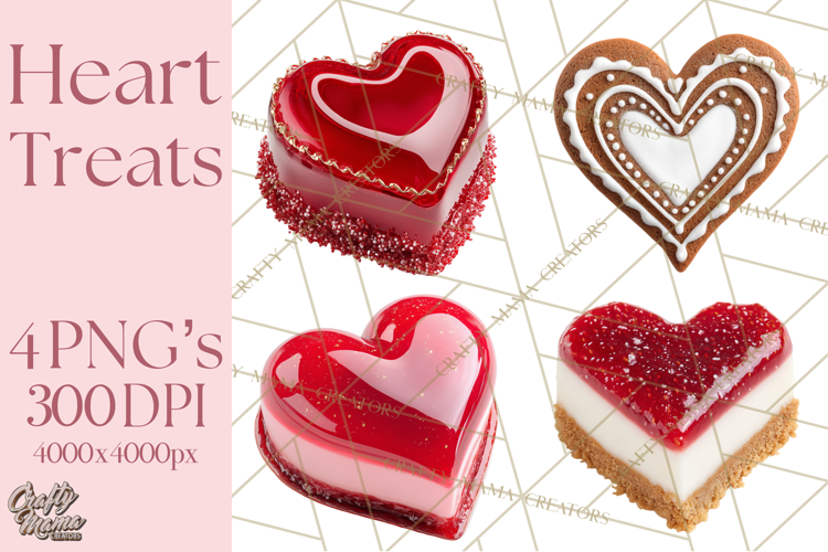 This digital graphic listing features a delightful variety of 3D heart-shaped desserts and bakery treats, perfect for creating unique Valentine's Day projects, cards, and digital crafts. These high-quality images include various cakes, cookies, and sweet confections.
