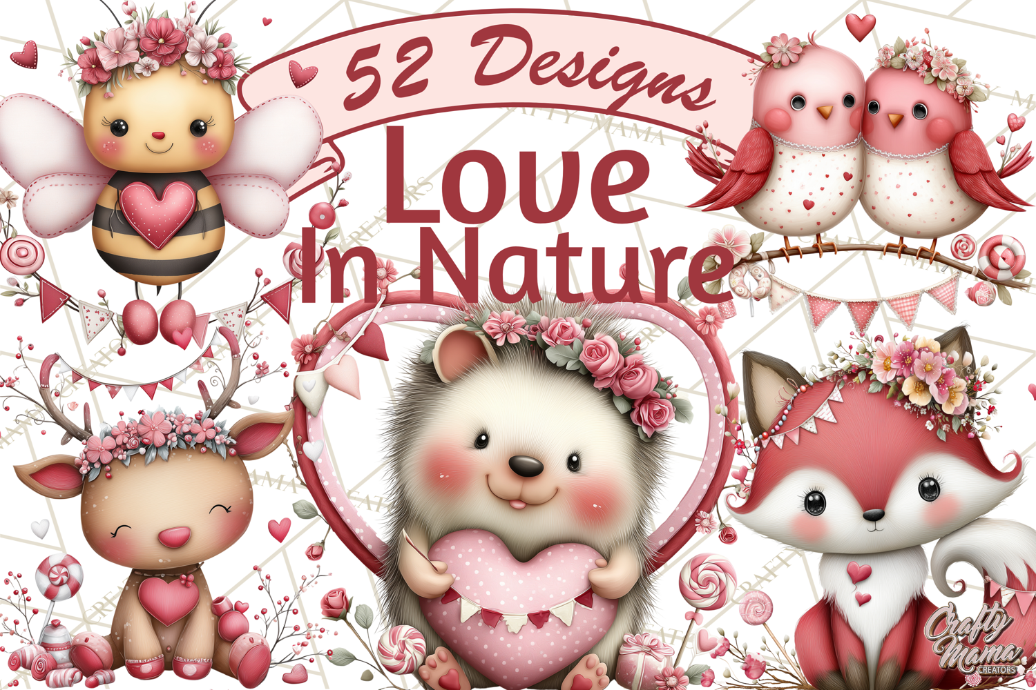 Celebrate romance in the great outdoors with this whimsical Love in Nature clipart collection! Perfect for cards, planners, scrapbooking, and digital designs, each illustration blends heart-shaped details with natural elements like trees, flowers, animals, and landscapes.