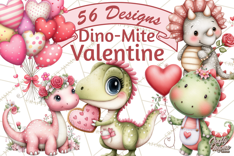 Add some prehistoric sweetness to your Valentine's Day projects with these adorable dinosaur illustrations! This fun assortment features chunky T-Rexes, Triceratops, Stegosauruses, and more, all celebrating the season of love. You will find these cute creatures holding heart balloons, sharing milkshakes, and carrying love letters, making them perfect for creating kids' valentine cards, sublimation t-shirts, mugs, stickers, and classroom decor.