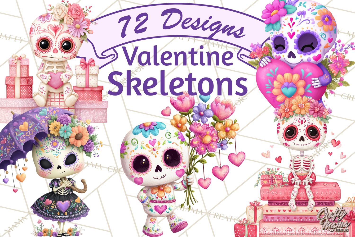 Bring festive Valentine charm to your designs with this Valentine Sugar Skull Skeleton clipart collection! Each calavera chibi skeleton features colorful Día de los Muertos–inspired patterns, floral accents, and adorable Valentine elements — perfect for cards, stickers, party décor, scrapbooking, sublimation, and more.
