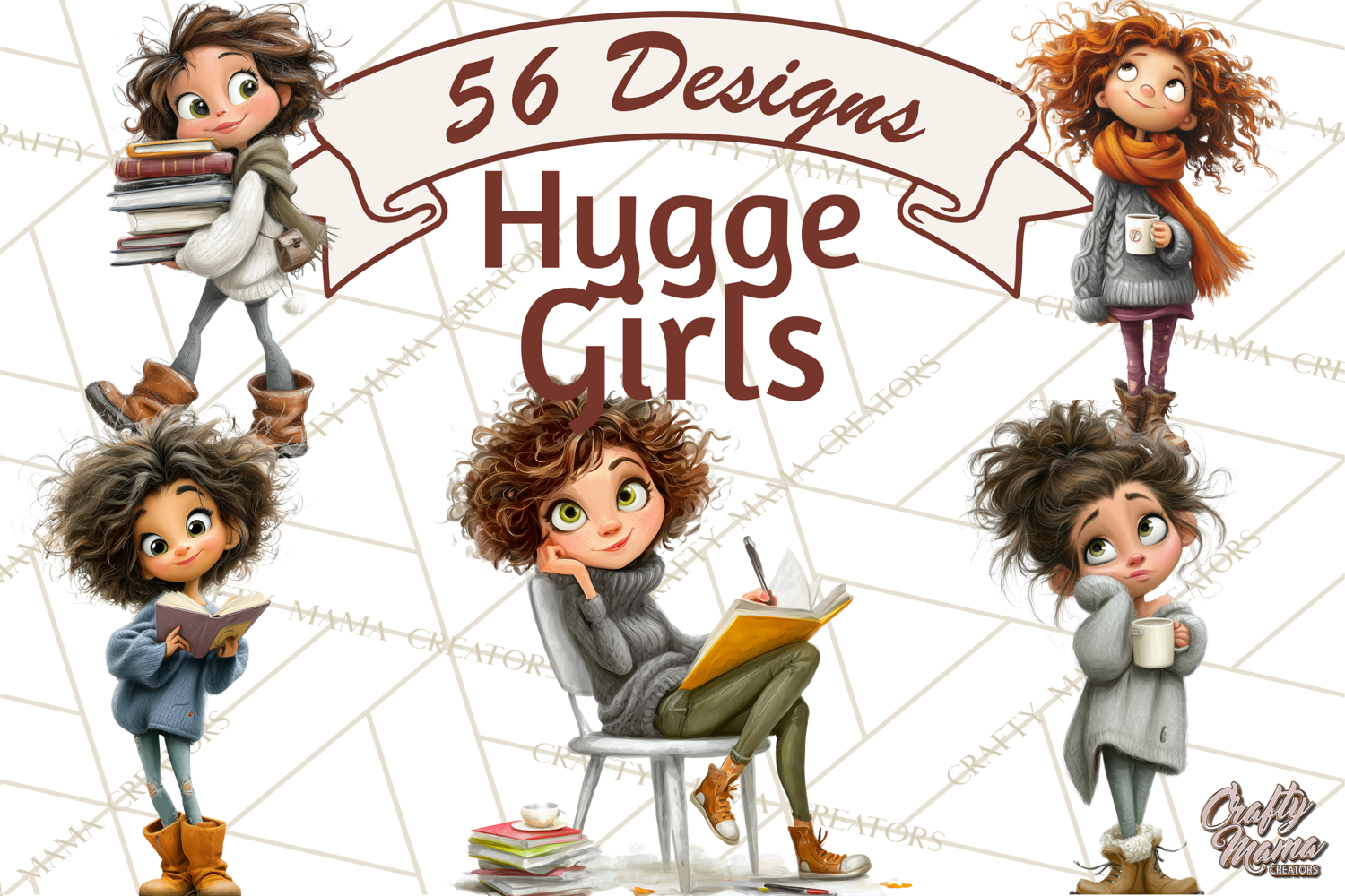 This charming collection features 56 cozy winter girl illustrations, each showcasing soft hygge-inspired outfits, oversized sweaters, warm leggings, winter boots, scarves, cocoa mugs, and calming bookish poses. Designed in a clean, crisp art style, these illustrations blend warmth and minimal Scandinavian aesthetics, making them perfect for winter crafting and year-round cozy vibes.