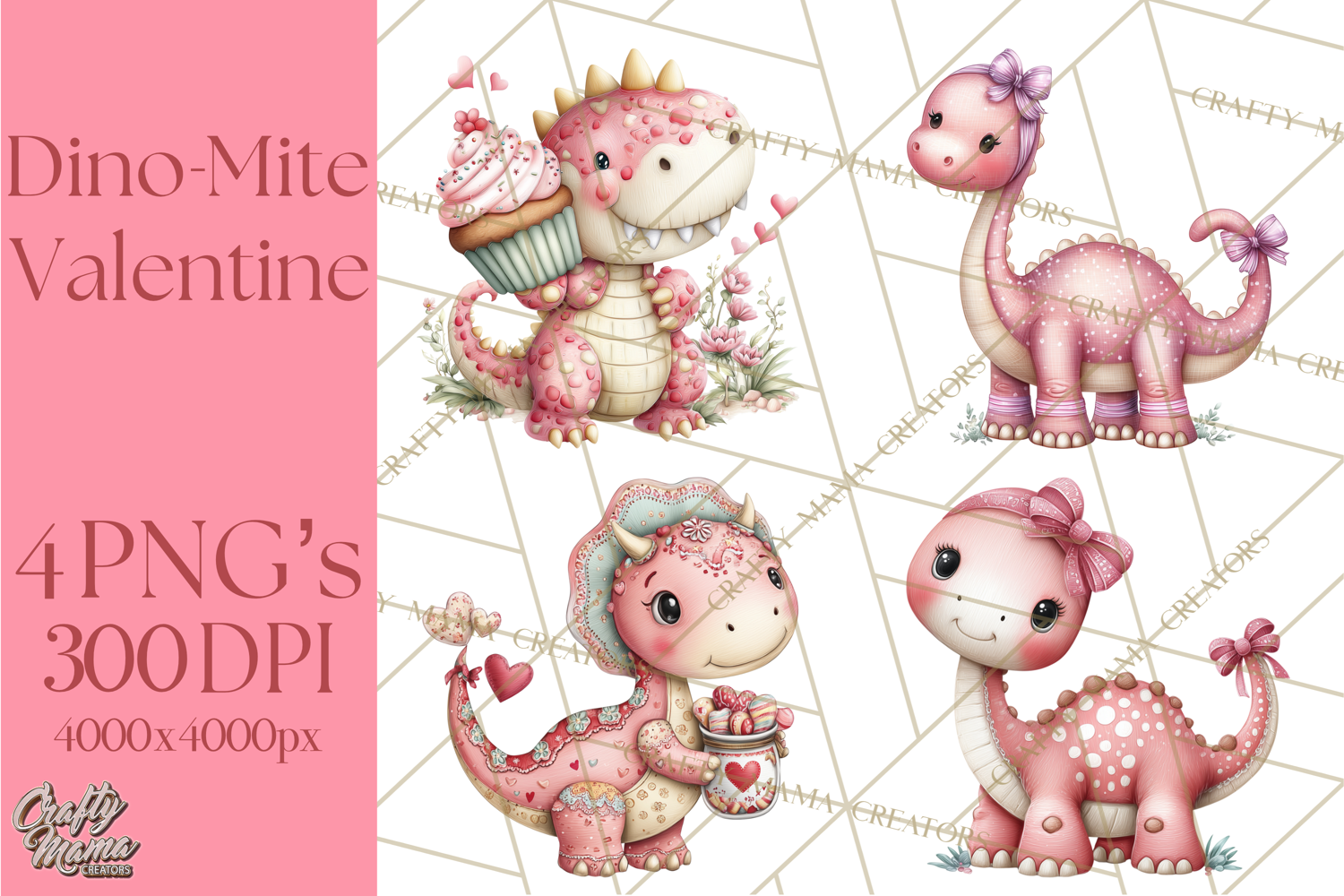 Add some prehistoric sweetness to your Valentine's Day projects with these adorable dinosaur illustrations! This fun assortment features chunky T-Rexes, Triceratops, Stegosauruses, and more, all celebrating the season of love. You will find these cute creatures holding heart balloons, sharing milkshakes, and carrying love letters, making them perfect for creating kids' valentine cards, sublimation t-shirts, mugs, stickers, and classroom decor.