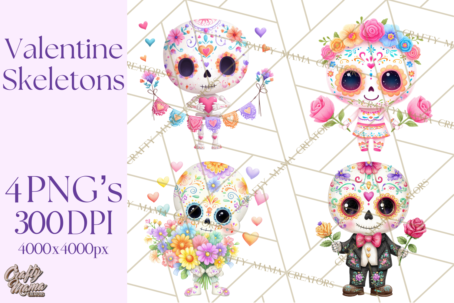 Bring festive Valentine charm to your designs with this Valentine Sugar Skull Skeleton clipart collection! Each calavera chibi skeleton features colorful Día de los Muertos–inspired patterns, floral accents, and adorable Valentine elements — perfect for cards, stickers, party décor, scrapbooking, sublimation, and more.