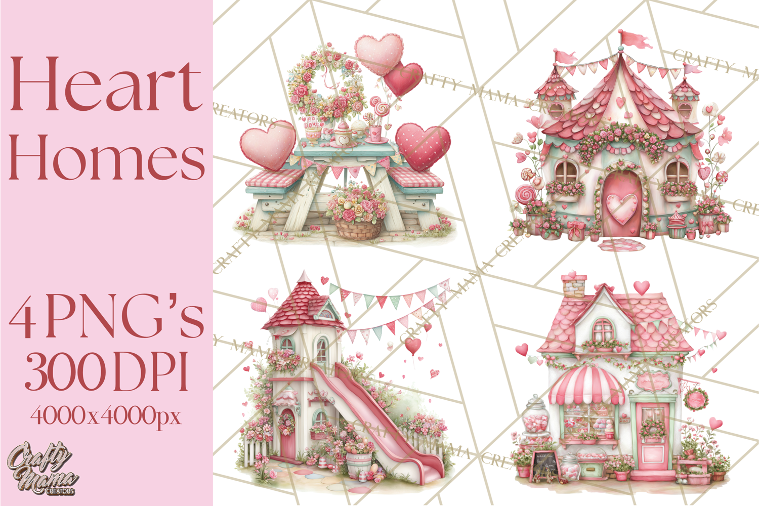 Step into a whimsical Valentine village with these adorable Heart Homes clipart illustrations! Perfect for cards, planners, scrapbooking, and digital designs, each home is crafted with charming heart-shaped details, pastel accents, and sweet decorative touches.