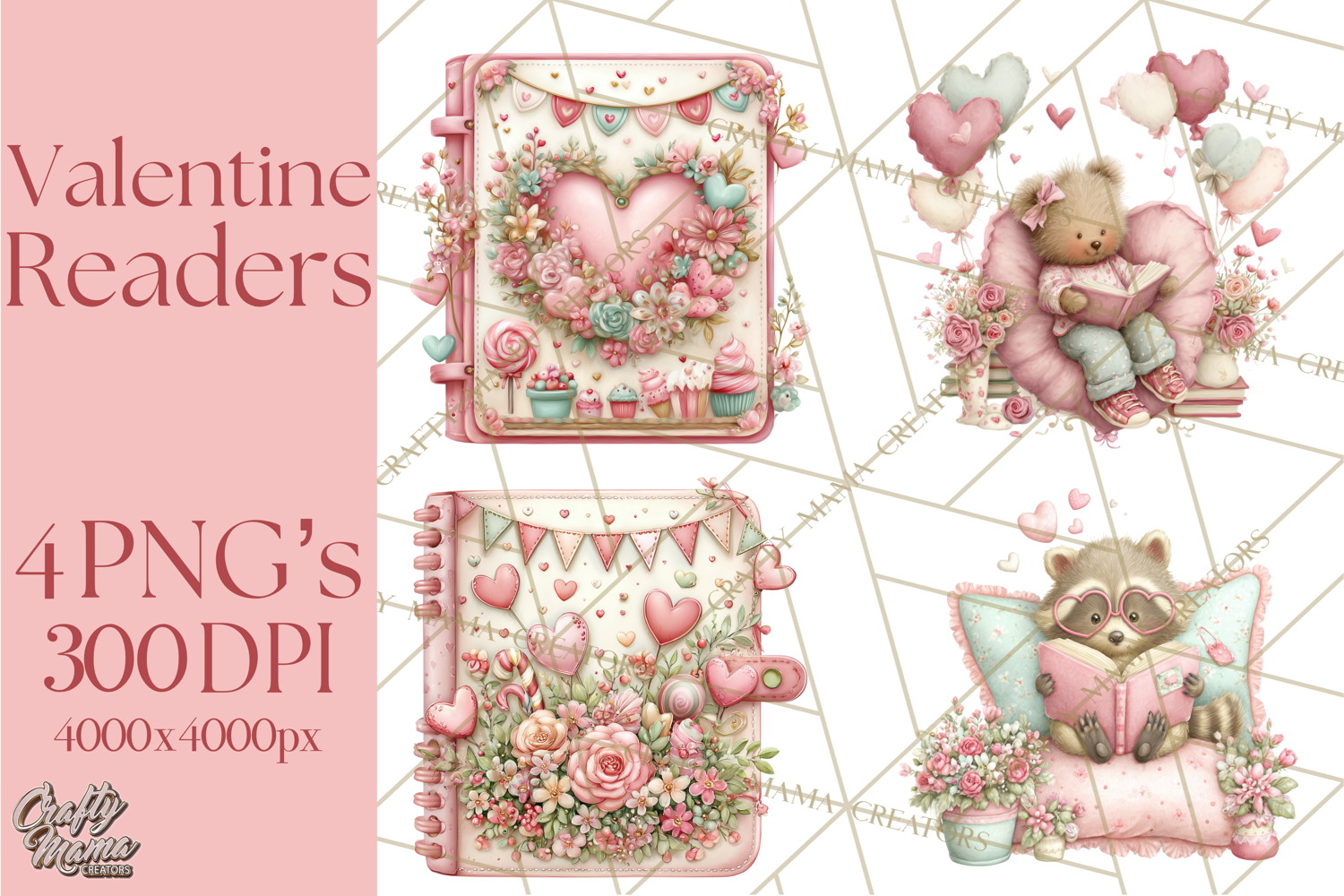 Bring cozy Valentine charm to your projects with this adorable collection of reading-themed animal illustrations! Each design features sweet woodland characters curled up with books, wrapped in heart blankets, or seated in charming Valentine reading corners. Teachers, librarians, crafters, and book lovers will adore these warm and whimsical Valentine reader graphics.