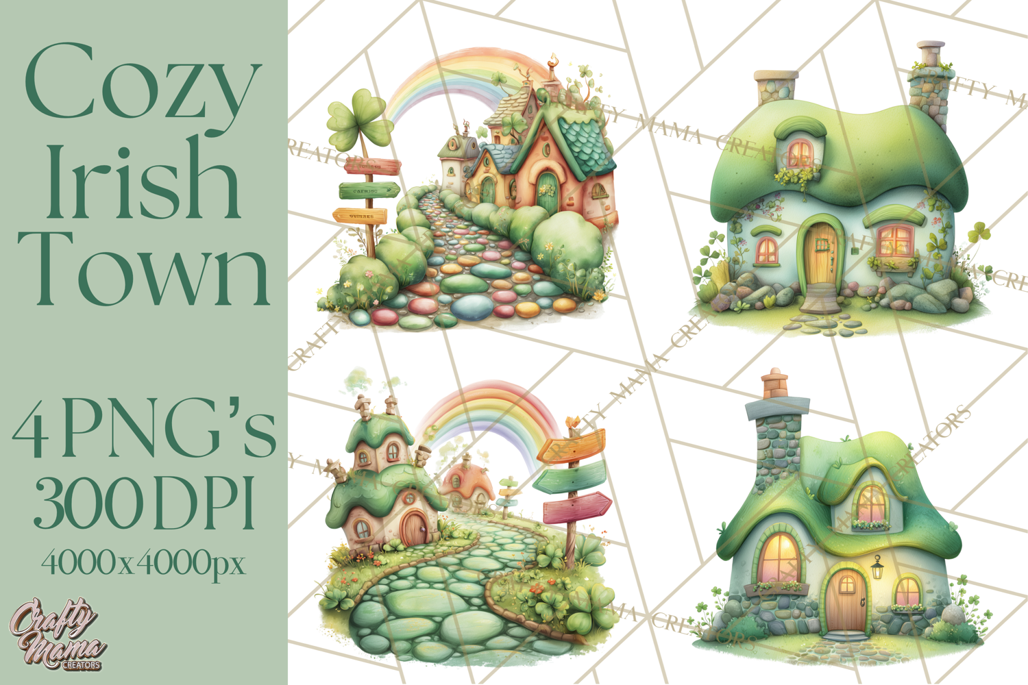 Welcome to a whimsical St. Patrick’s Day Storybook Town — a charming collection of soft, cozy Irish village illustrations your customers can use to build their own magical scenes! This adorable clipart collection features rounded cottages, clover-filled shops, cobblestone streets, rainbow signposts, tiny bridges, scenic props, and warm storybook textures perfect for planners, sublimation, invitations, scrapbooking, stickers, and more.