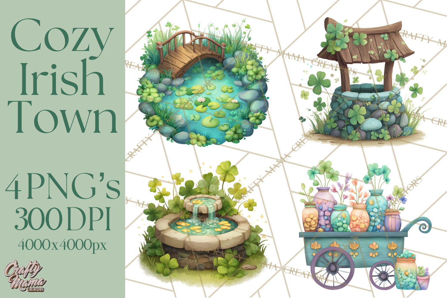 Welcome to a whimsical St. Patrick’s Day Storybook Town — a charming collection of soft, cozy Irish village illustrations your customers can use to build their own magical scenes! This adorable clipart collection features rounded cottages, clover-filled shops, cobblestone streets, rainbow signposts, tiny bridges, scenic props, and warm storybook textures perfect for planners, sublimation, invitations, scrapbooking, stickers, and more.