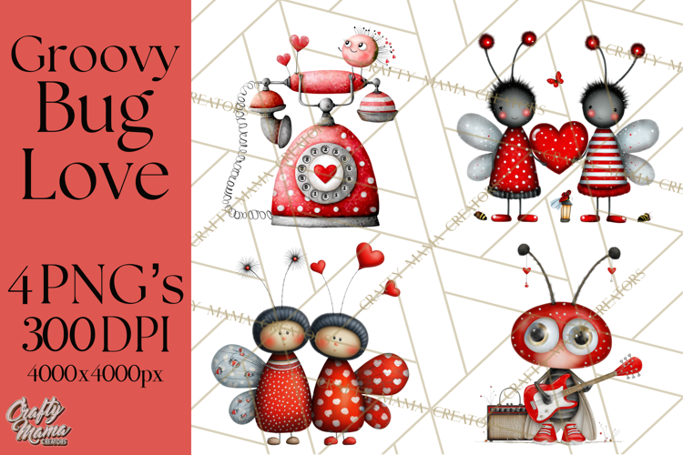 Similar Design Products to Groovy Retro Valentine Bug Clipart PNG, 70s Love Clip Art