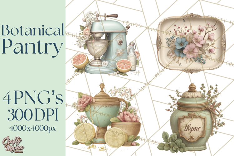 Bring a warm, cozy botanical charm to your creative projects with this Botanical Cottage Pantry Clipart collection. These cottage-inspired kitchen elements are perfect for adding a natural, rustic touch to planners, stickers, product labels, recipe cards, wall art, branding, invitations, and more.