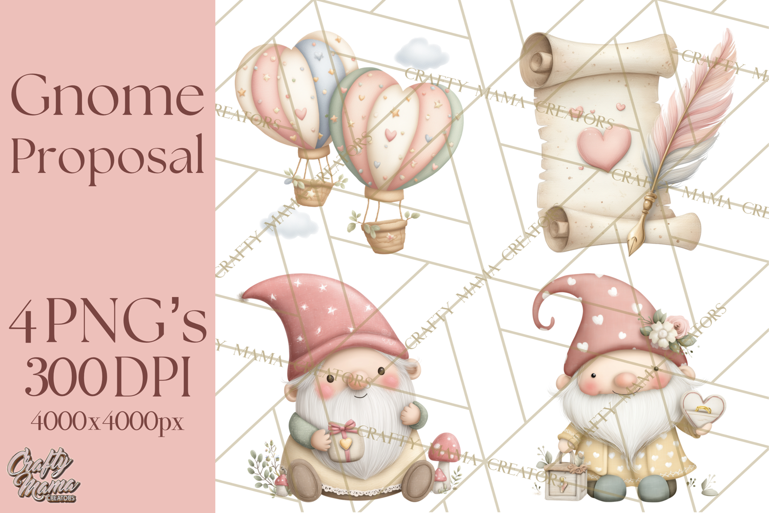 Celebrate love and commitment with this adorable Gnome Valentine's Day Proposal illustration set. Featuring miniature gnome characters in romantic scenes, detailed proposal props like ring boxes and champagne flutes, beautiful roses, cozy picnic setups, and tiny wedding elements. This unique mini world collection is perfect for creating engagement announcements, wedding invitations, Valentine's Day cards, sublimation designs, and charming printable home decor for couples.
