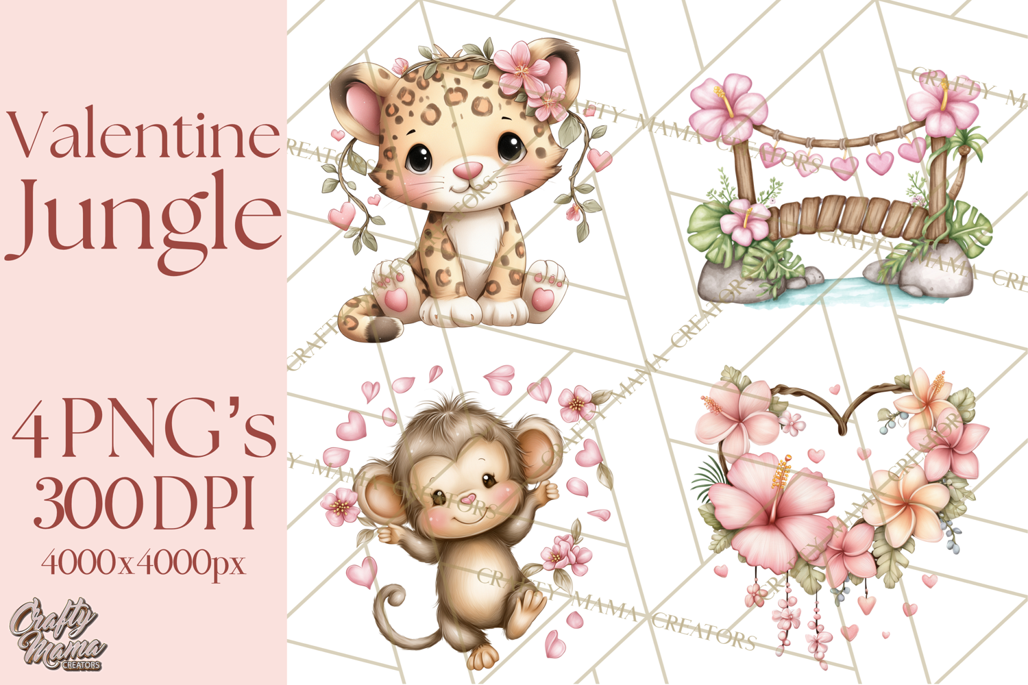 Bring the magic of a Valentine jungle to your creative projects! This adorable mini-world bundle includes 4 files featuring cute jungle animals, Valentine props, and charming jungle scenes.