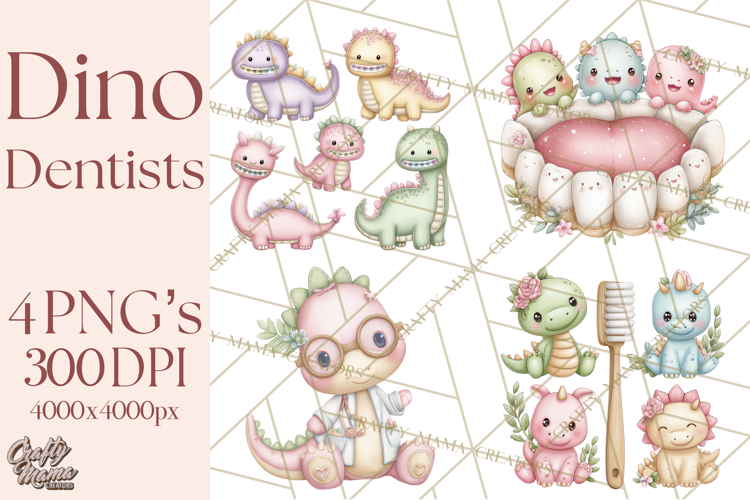 Make dental care fun and adorable with these soft-realistic dinosaur dentist printables! This collection includes 4 PNG files featuring baby dinosaurs as dentists, hygienists, and pediatric patients, along with colorful dental tools and kid-friendly teeth characters. Perfect for dental office décor, educational projects, stickers, planners, sublimation, and more.