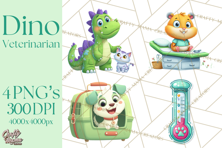 Bring cuteness and fun to veterinary care with these soft-realistic dinosaur veterinarian printables! This collection includes 4 PNG files featuring baby dinosaurs as vets, assistants, and adorable animal patients, along with paw-print accessories and kid-friendly medical tools. Perfect for educational projects, pediatric vet décor, stickers, planners, sublimation, and more.