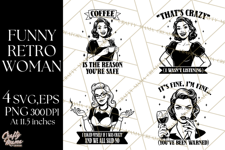 Funny Retro Housewife Svg Files Sarcastic Woman Svg Files For Cricut 1950's Girl Svg Designs Vintage Funny Svg File For Shirt Women's Snarky Quote Women's Funny Shirt Svg File I Asked Myself If I Was Crazy And We All Said No Coffee Is The Reason You're Safe Svg Thats Crazy I Wasn't Listening It's Fine I'm Fine You've Been Warned