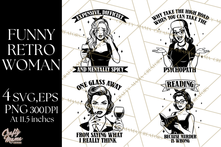 Reading Because Murder Is Wrong Funny Retro Housewife Svg Files Sarcastic Woman Svg Files For Cricut 1950's Girl Svg Designs Vintage Funny Svg File For Shirt Women's Snarky Quote Women's Funny Shirt Svg File Expensive Difficult And Mentally Spicy One Glass Away Form Saying What I Really Think Take The High Road When You Can Take Psychopath