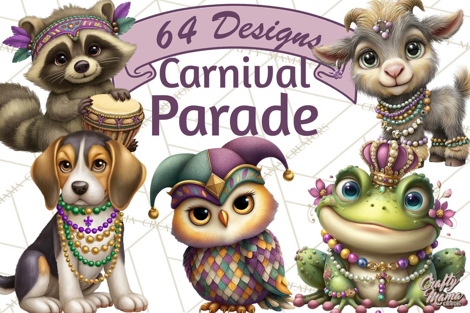 Each design features adorable animals dressed in Mardi Gras costumes plus festive props like beads, masks, drums, and floats. Use them to create printable party decor, stickers, or digital designs that capture the joy of the parade.