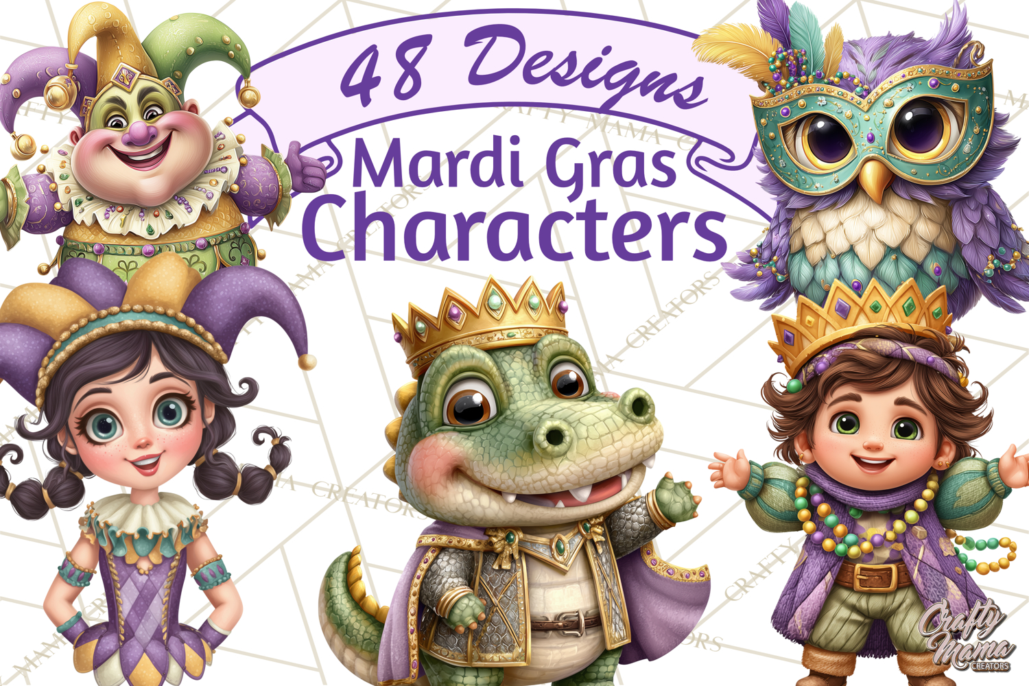Add playful charm to your carnival designs with this cute Mardi Gras clipart collection featuring a wide variety of friendly characters. This festive clip art includes adorable animals, kids, and whimsical Mardi Gras characters dressed in classic purple, green, and gold colors.