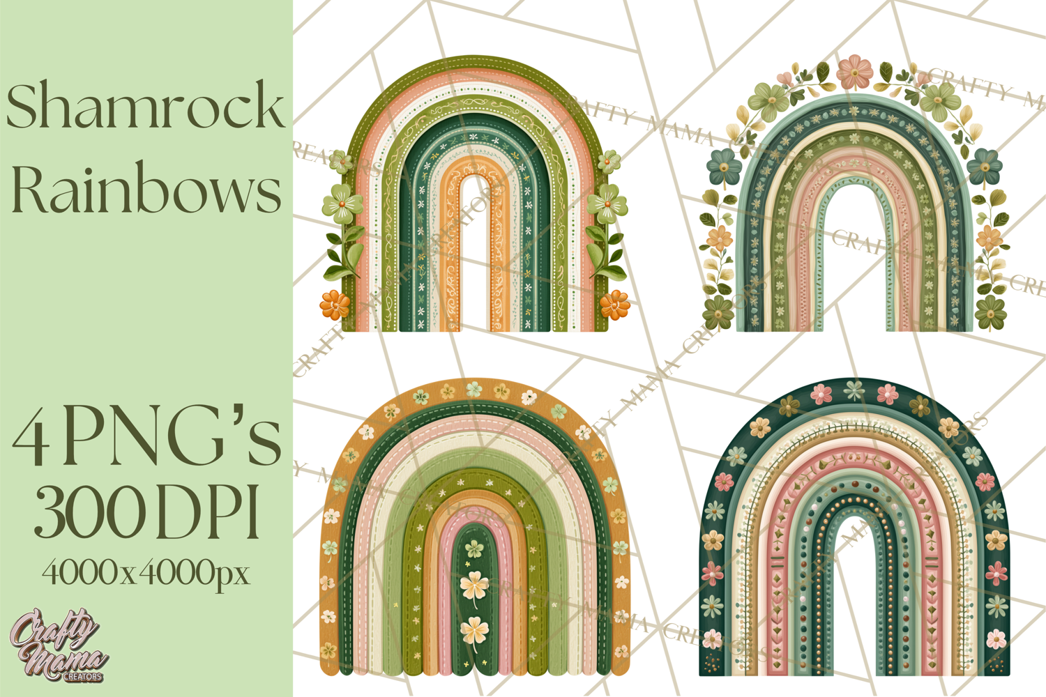 St Patricks Patterned Rainbow PNG, Boho Shamrock Clipart