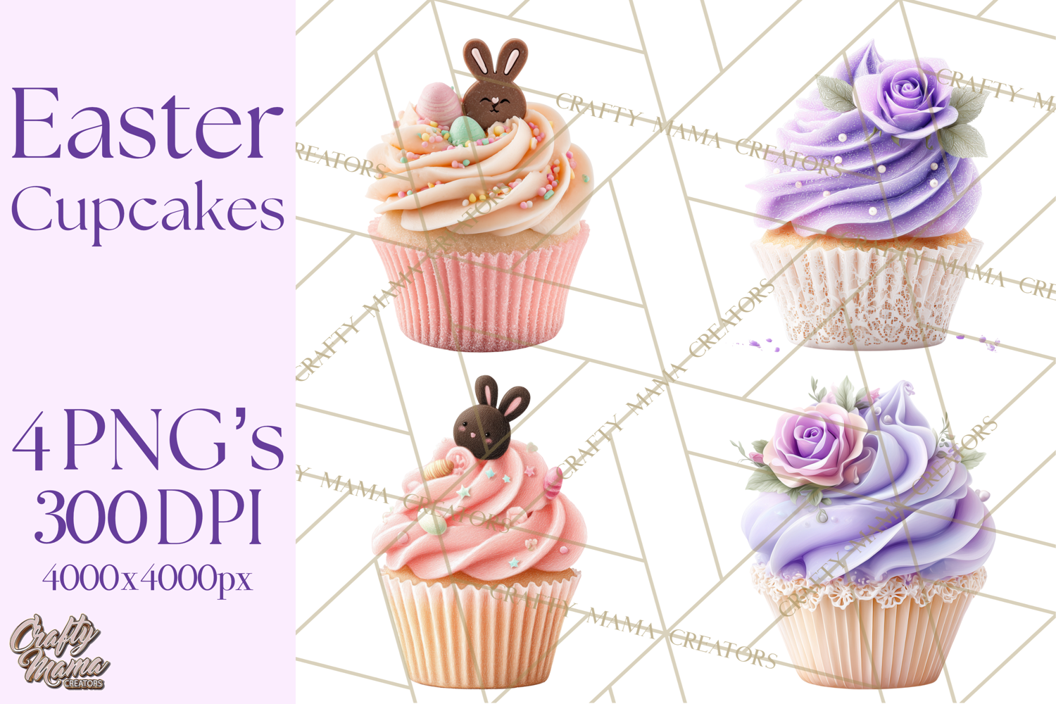 Each cupcake is styled with a polished bakery-style illustration look — slightly realistic with an illustrated finish — making them versatile for both playful and refined Easter designs.
