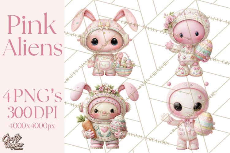 This collection blends pastel Easter elements with a polished, dimensional alien character look, making it perfect for creators who love soft textures and charming character art.