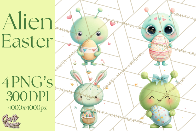 Perfect for adding a unique twist to traditional Easter themes, these alien designs pair classic Easter elements with a playful character style that works beautifully for both kids and adults.