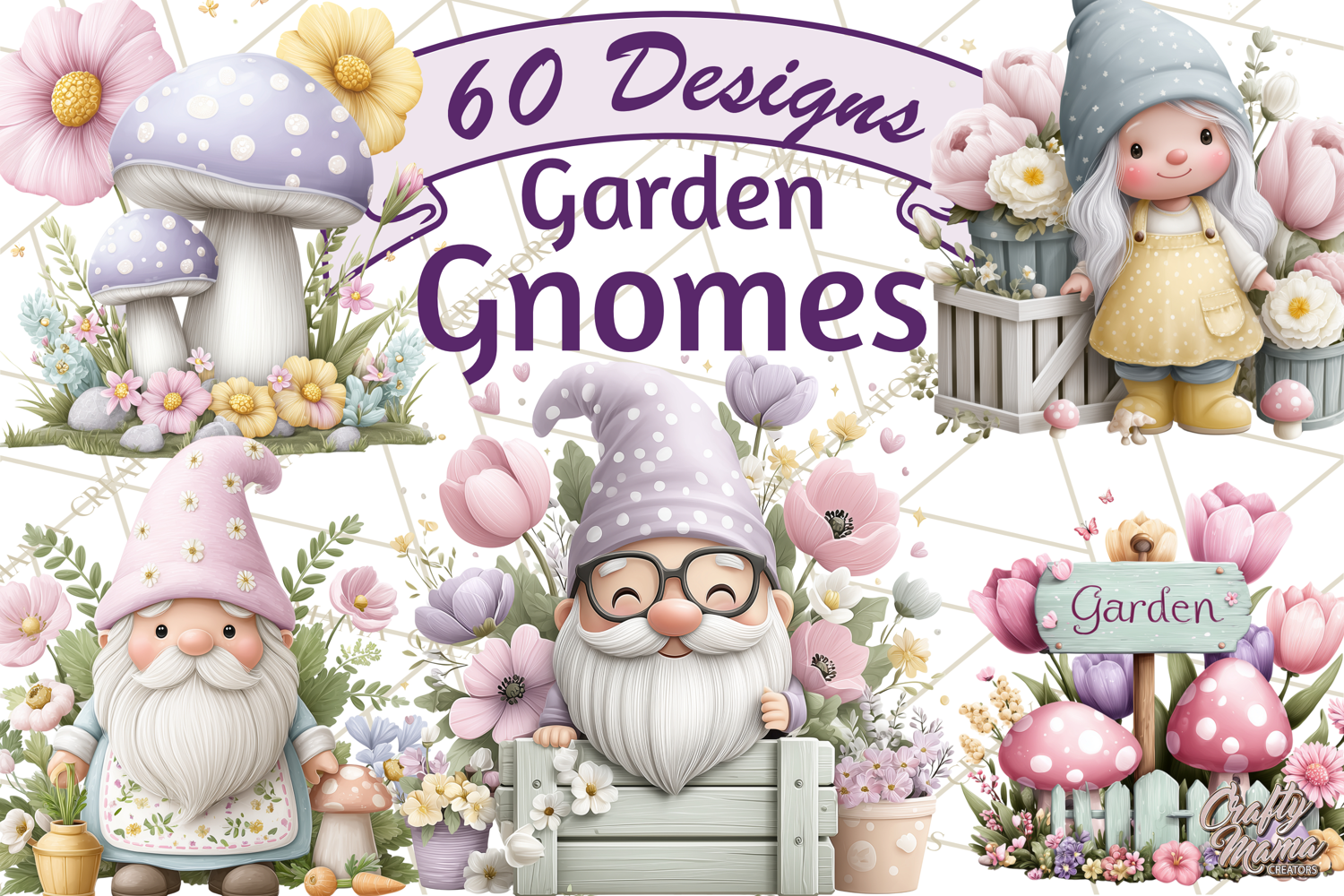 Bring whimsical charm to your spring projects with this Easter Garden Gnomes clipart bundle! Featuring 60 super cute mini world gnomes and garden props, this set is perfect for cards, invitations, scrapbooking, wall art, and more.