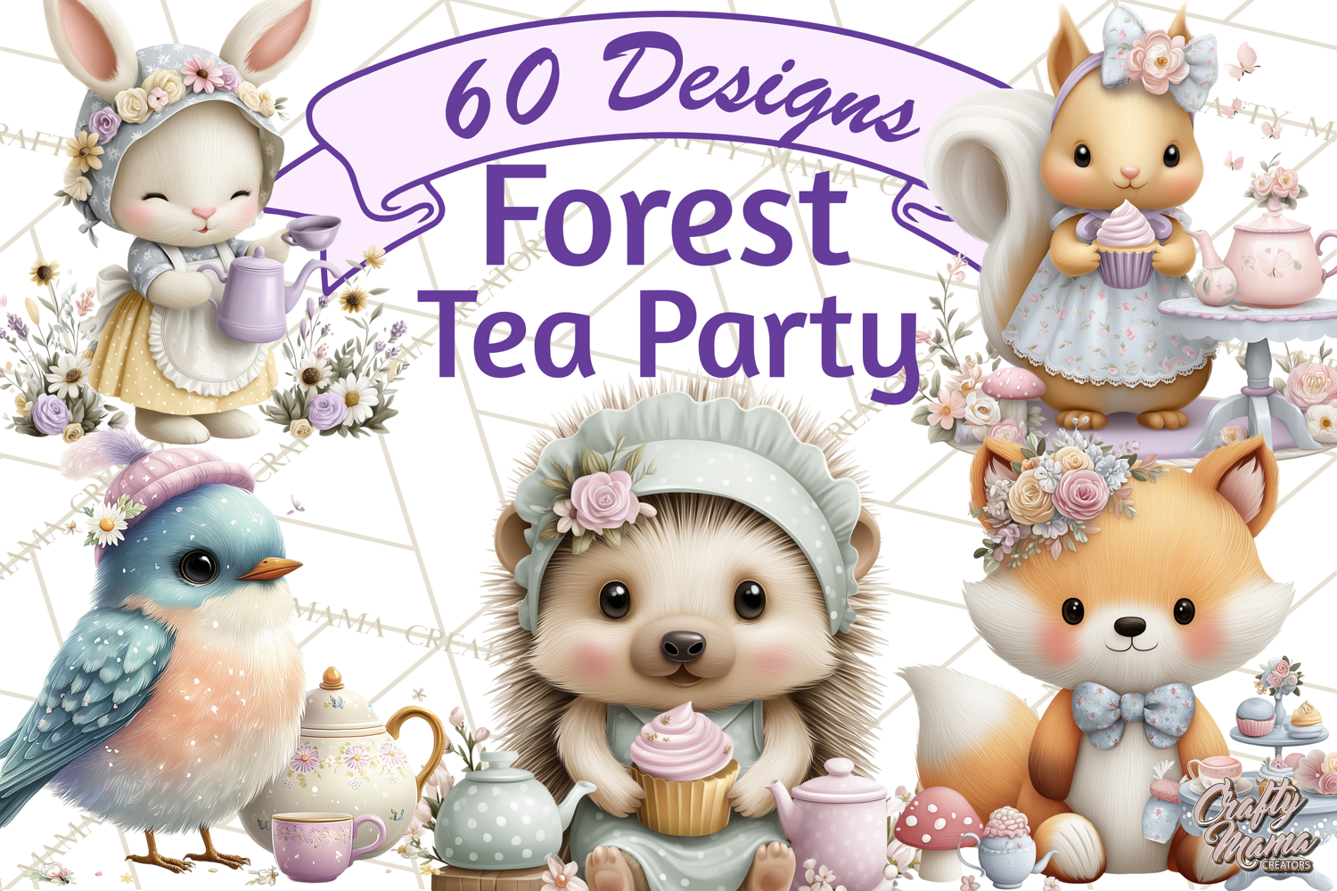 Bring whimsy and charm to your spring and Easter designs with this Easter Tea Party Forest Friends clipart collection. Featuring adorable woodland animals enjoying a pastel tea party, plus coordinating props, this bundle is perfect for creating unique, storybook-inspired projects.