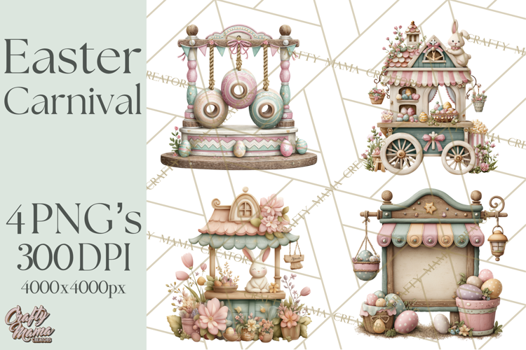 Bring festive Easter fun to your creative projects with this Easter Carnival clipart collection! This bundle includes 4 high-quality PNG images featuring pastel carnival booths, Ferris wheels, spring rides, egg toss games, bunny-themed prizes, cotton candy stands, dessert carts, and charming carnival décor.