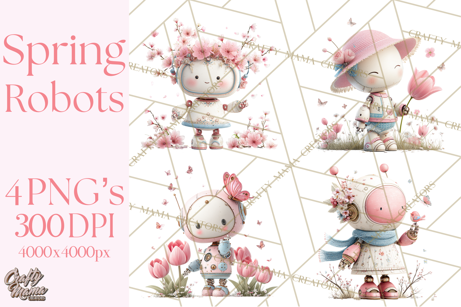 Adorable spring-inspired robots in soft pastel colors interacting with flowers, butterflies, birds, and playful spring elements, perfect for seasonal crafts, invitations, and digital projects. Each illustration captures whimsical full-body robots enjoying cheerful springtime scenes, creating a fresh, lively aesthetic for your designs.