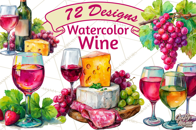 This watercolor wine clipart includes hand-painted style illustrations inspired by wine, alcohol, and drinking experiences. Artwork features wine glasses, bottles, grapes, grapevines, florals, fruits, charcuterie foods, and elegant wine pairings, all designed with a cohesive watercolor look.