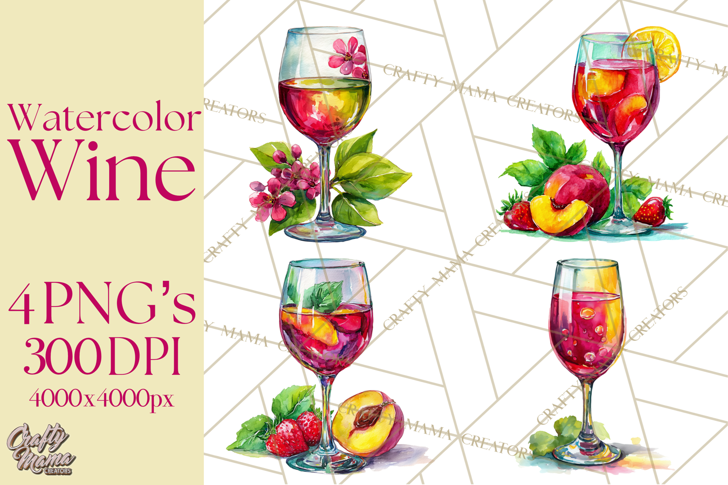 This watercolor wine clipart includes hand-painted style illustrations inspired by wine, alcohol, and drinking experiences. Artwork features wine glasses, bottles, grapes, grapevines, florals, fruits, charcuterie foods, and elegant wine pairings, all designed with a cohesive watercolor look.