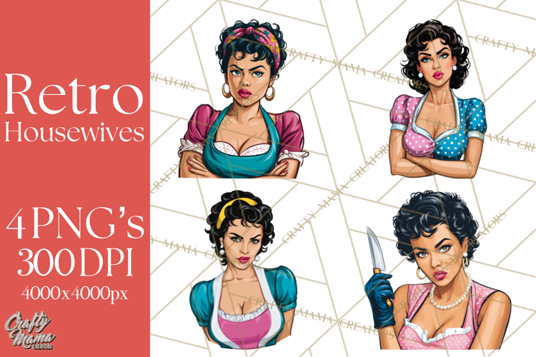 Bring iconic mid-century charm to your designs with this vintage 1950s housewife clipart. Featuring waist-up and shoulder-up illustrated women, this artwork showcases classic retro housewife activities like baking, cleaning, laundry, cooking, wine sipping, and bold kitchen scenes — all infused with expressive personality.