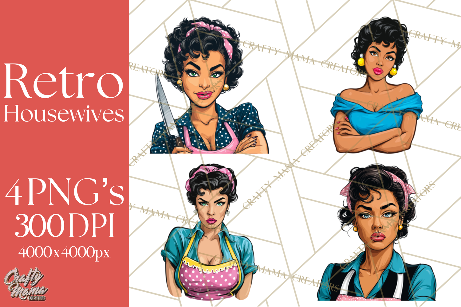 Bring iconic mid-century charm to your designs with this vintage 1950s housewife clipart. Featuring waist-up and shoulder-up illustrated women, this artwork showcases classic retro housewife activities like baking, cleaning, laundry, cooking, wine sipping, and bold kitchen scenes — all infused with expressive personality.