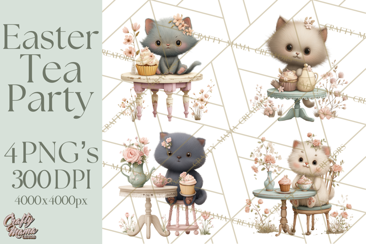 This Springtime Baby Animal Tea Party clipart collection features adorable pastel bunnies, chicks, lambs, and puppies enjoying soft, cozy tea parties with pastel teacups, tiny cakes, and spring flowers. Perfect for nursery art, Easter, and spring-themed projects, all illustrations are gentle, playful, and versatile.