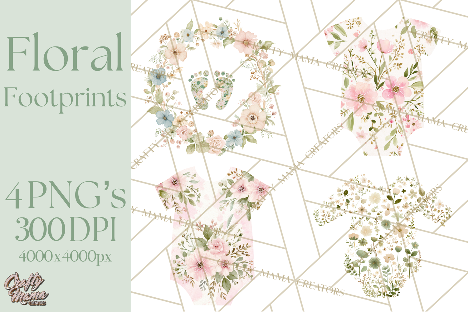 Each design is created with watercolor florals shaped into baby footprints, hearts, wreaths, onesies, teddy bears, and botanical accents, making this collection versatile and easy to use across many projects.