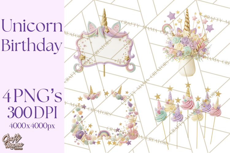 Bring a magical touch to any celebration with this Unicorn Birthday Party clipart collection, perfect for kids’ birthdays, party printables, and DIY decorations. Designed in pastel rainbow colors with soft gold accents, these coordinating party elements can be used across invitations, décor, table settings, and more.