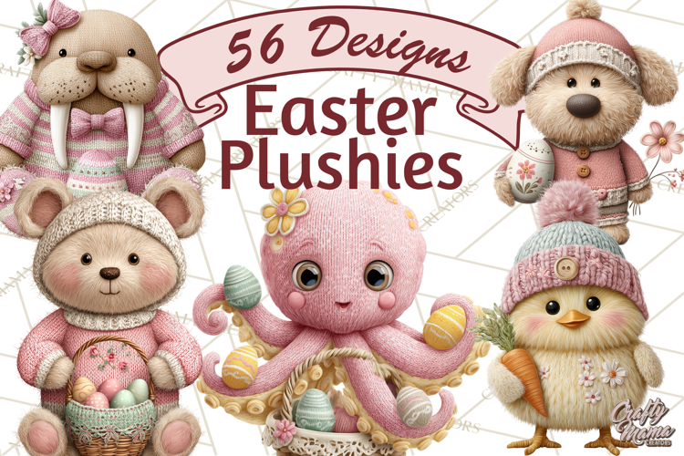 Easter designs with this adorable knitted plush animal clipart collection. Each image is a full-body, cute yarn animal with Easter props — perfect for digital crafts, invitations, party decor, stickers, and more!