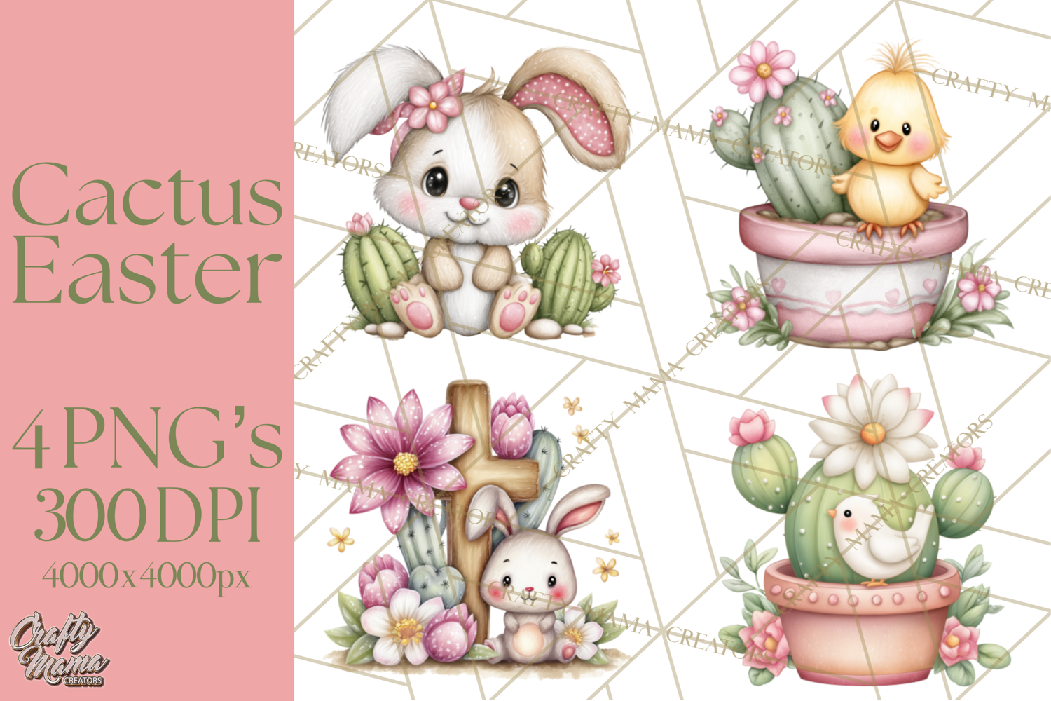 This Easter cactus clipart features playful spring cactus artwork, faith-inspired Christian Easter illustrations, and fun bunny-themed designs. Each image is designed in a soft, cheerful style that works beautifully across a wide range of creative projects.
