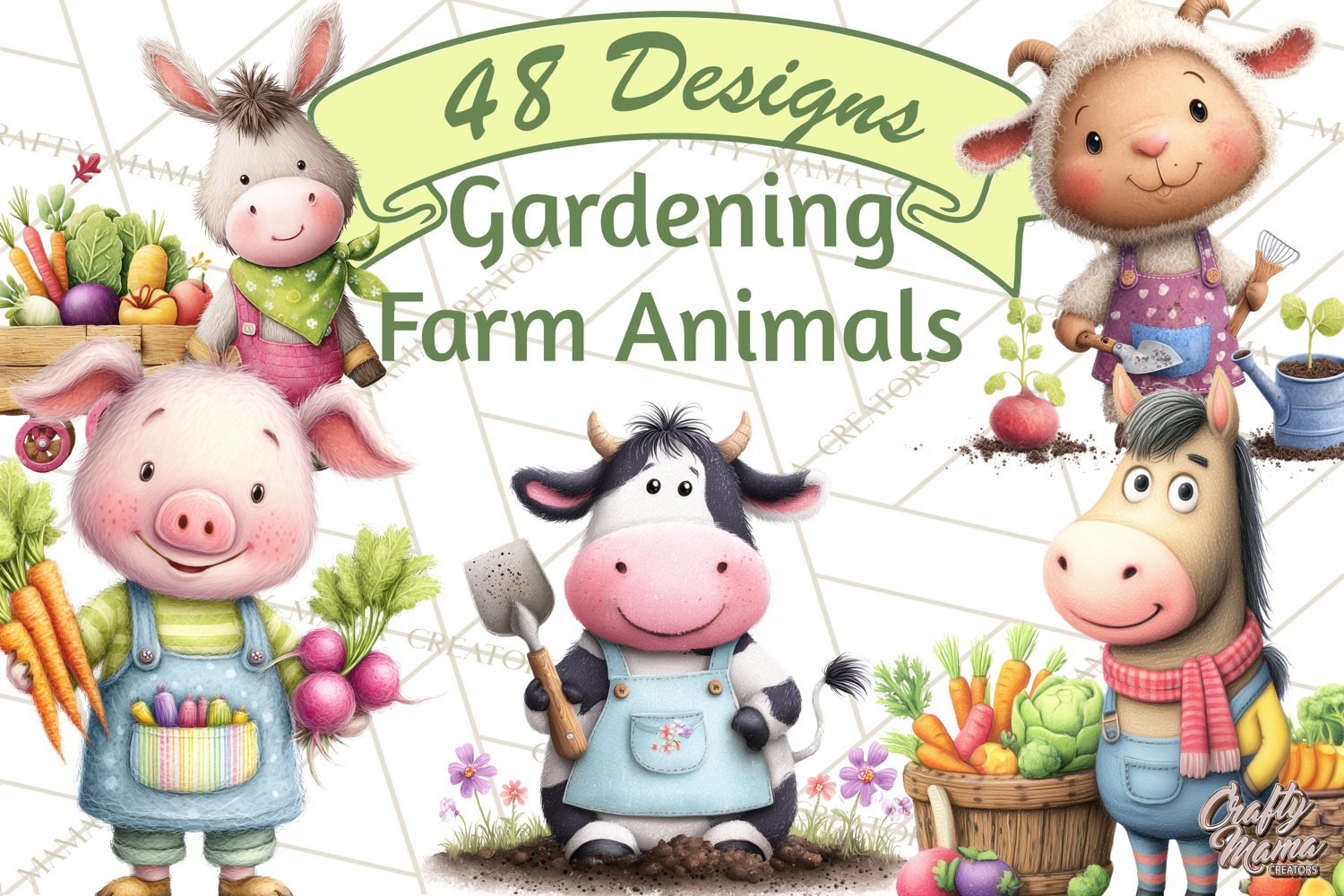 This cheerful farm animal clipart collection features adorable animals gardening, planting, watering, and harvesting vegetables. Perfect for spring crafts, classroom projects, kids designs, and farm-themed printables.