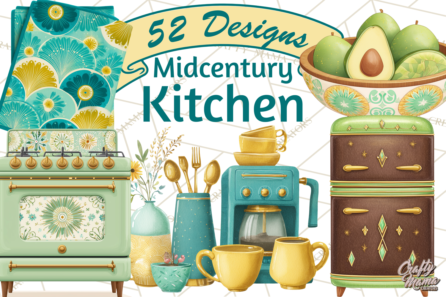 Bring sleek mid century modern style to your projects with this MCM Kitchen clipart bundle. Featuring retro modern appliances, baking tools, and vintage kitchen decor in teal, mustard, avocado, and walnut tones, this set is perfect for creating kitchen wall art, recipe cards, party invitations, labels, and more.
