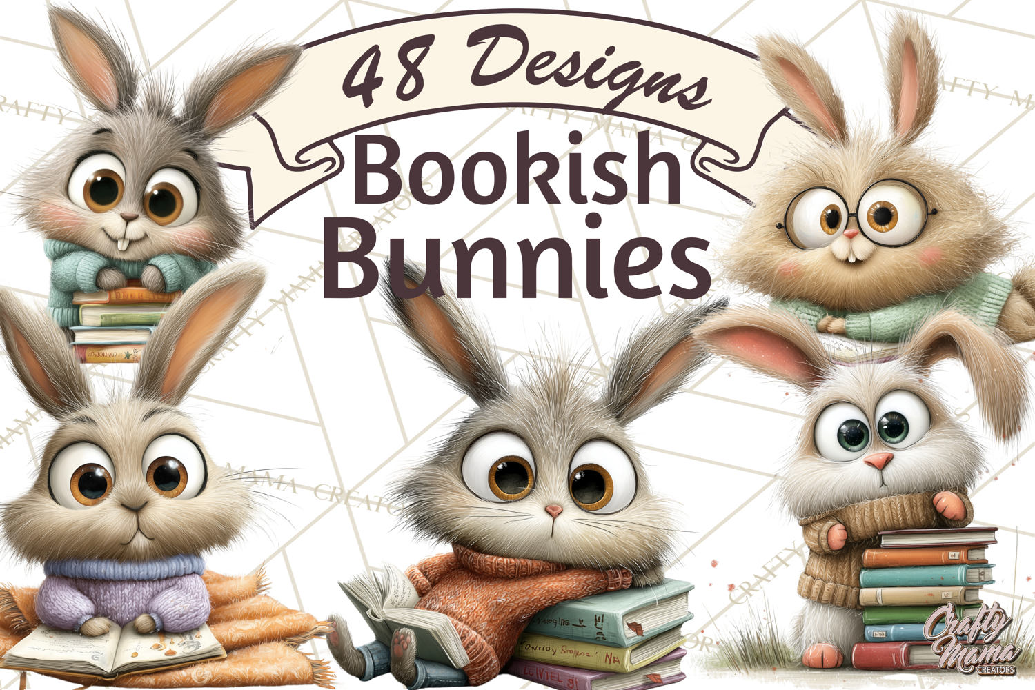 Bring adorable cozy vibes to your projects with this Bookish Bunnies PNG Clipart! This set includes 48 unique PNG files, each featuring cute bunnies with large cartoonish eyes, wearing sweaters and reading books. Perfect for scrapbooking, invitations, digital planners, card making, or any crafty project.