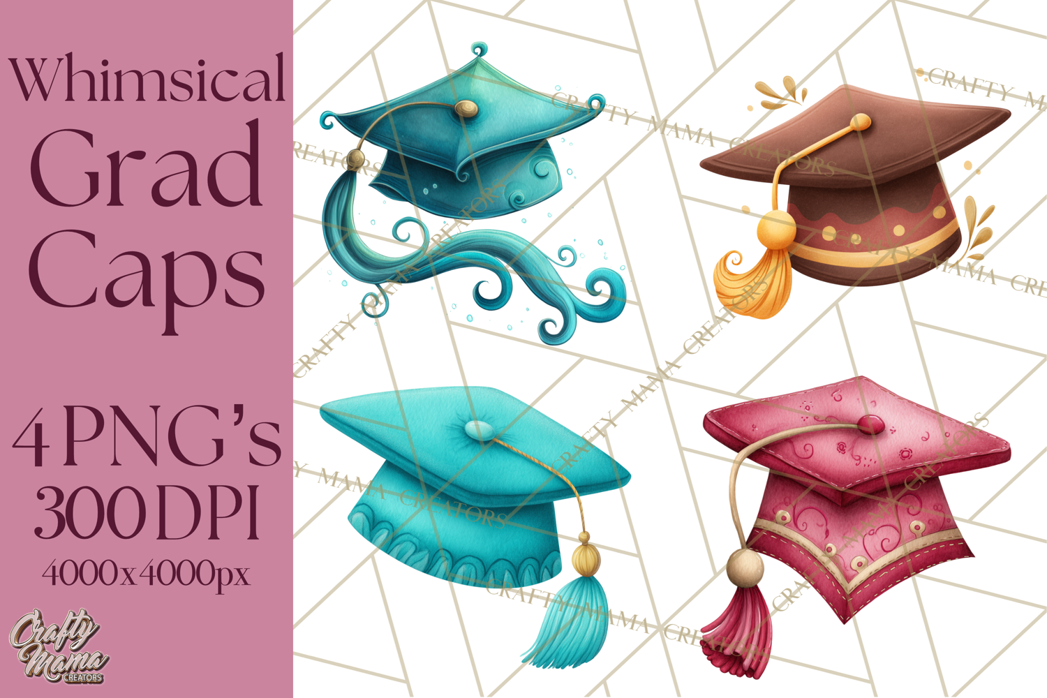 Celebrate graduation season with this whimsical graduation cap clipart collection, perfect for creating fun and charming designs for parties, gifts, and school projects. These playful graduation hats feature soft illustration details and flowing tassels, making them ideal for both kids and classic graduation themes.