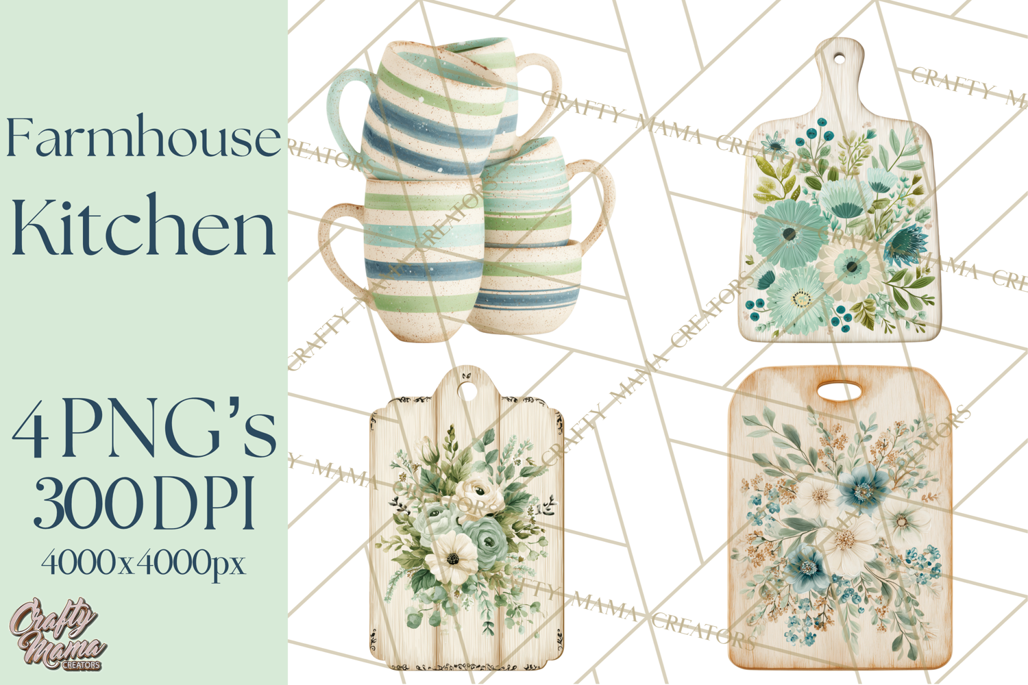 Bring cozy farmhouse charm to your projects with this Farmhouse Kitchen clipart bundle. Featuring cream appliances, cookware, utensils, and decor with muted blue and green accents, this set is perfect for creating kitchen wall art, recipe cards, party invitations, labels, and more.