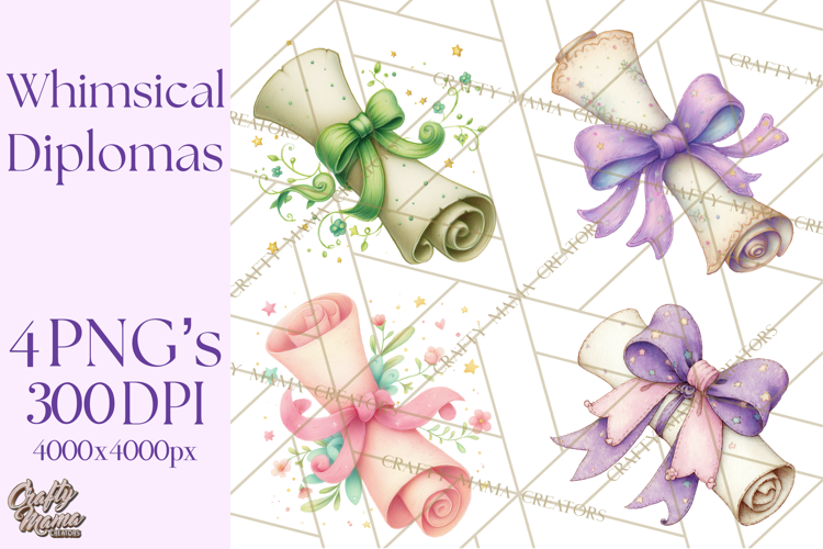 This whimsical graduation diploma clipart collection features playful rolled scrolls with colorful ribbons and charming decorative details. Designed with a soft, storybook-inspired style, these graduation diplomas are perfect for fun, celebratory, and kid-friendly designs.