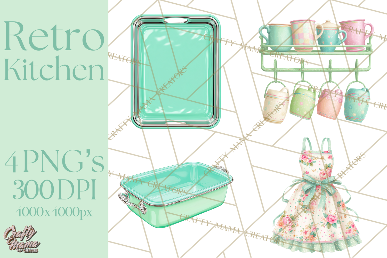 Bring nostalgic diner charm to your projects with this 50’s Retro Kitchen clipart bundle. Featuring pastel retro appliances, baking tools, and vintage kitchen decor, this set is perfect for creating kitchen wall art, recipe cards, party invitations, labels, and more.