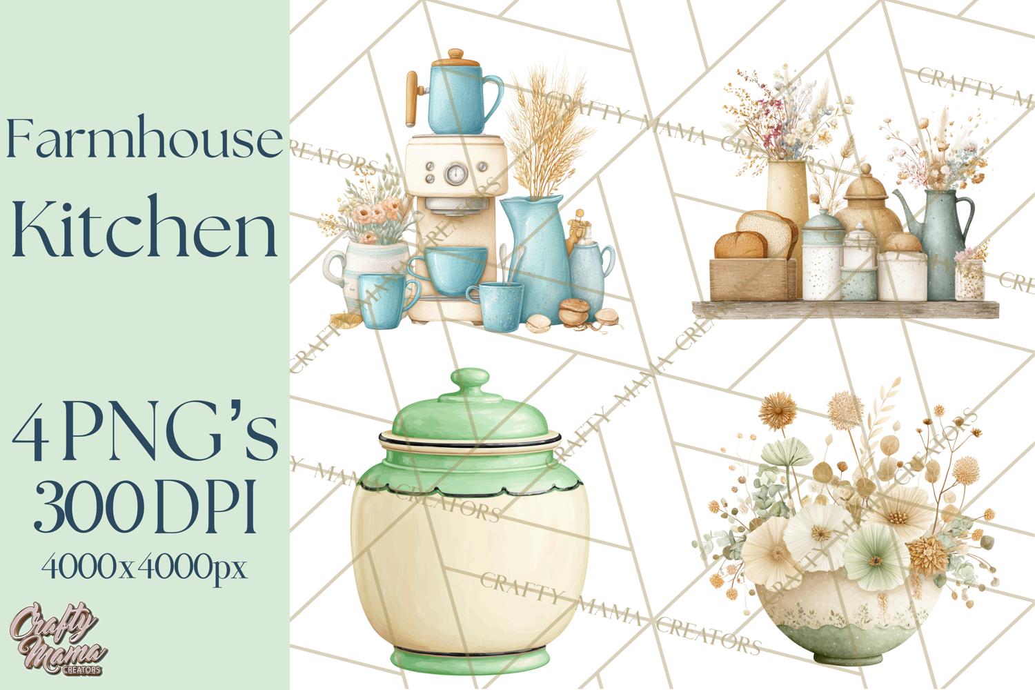 Bring cozy farmhouse charm to your projects with this Farmhouse Kitchen clipart bundle. Featuring cream appliances, cookware, utensils, and decor with muted blue and green accents, this set is perfect for creating kitchen wall art, recipe cards, party invitations, labels, and more.
