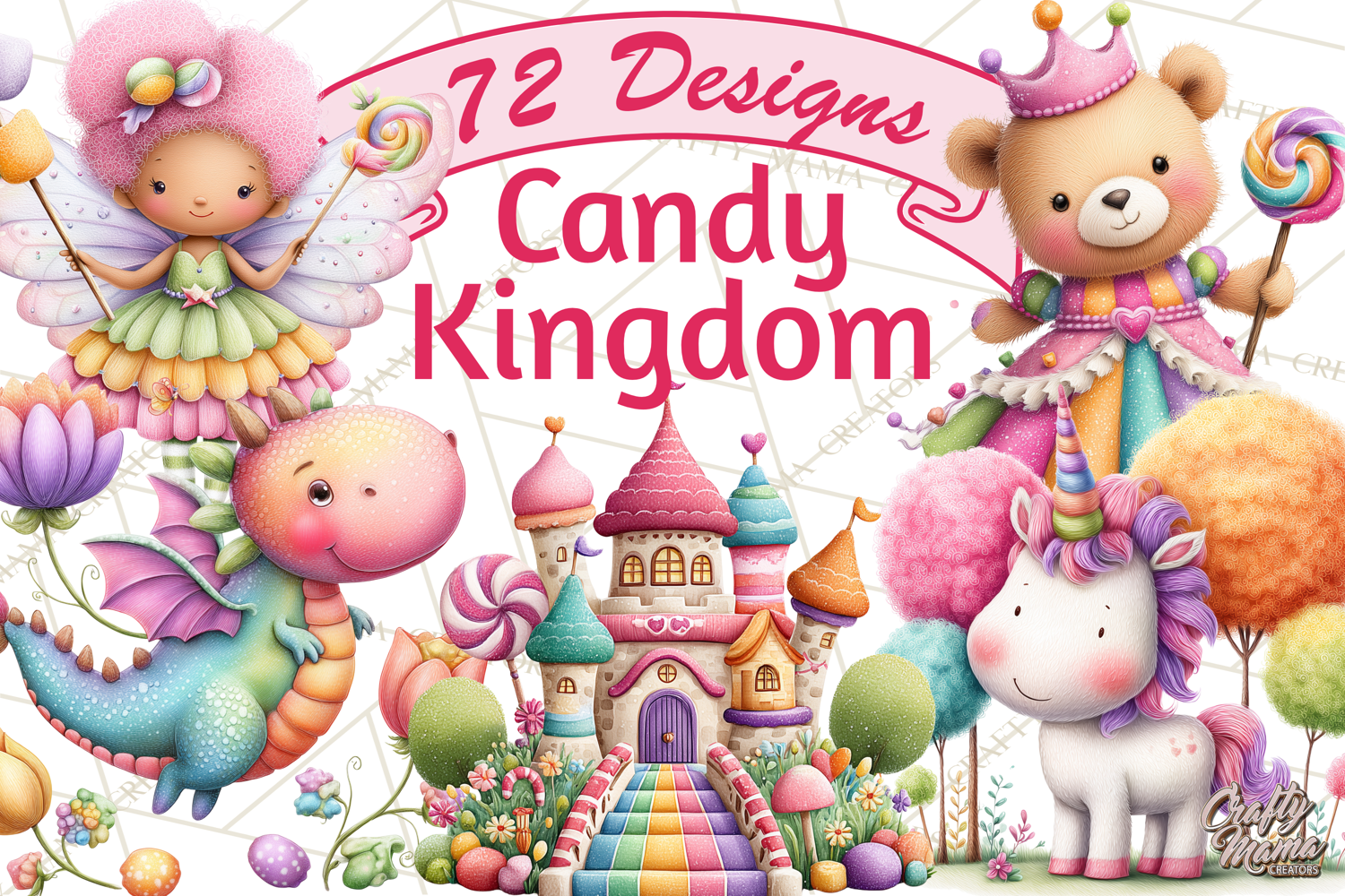 Step into a whimsical world of sweets with this Candy Kingdom clipart collection! Perfect for creating colorful fantasy designs filled with candy castles, adorable candy creatures, rainbow bridges, and magical sugary details.
